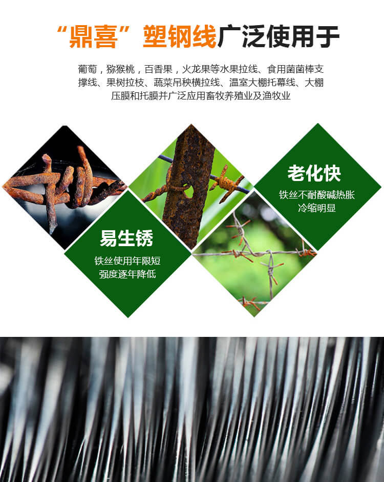 4、化学性:塑钢线耐酸碱、抗紫外线、不生锈、耐老化,使用寿命长,性能稳定